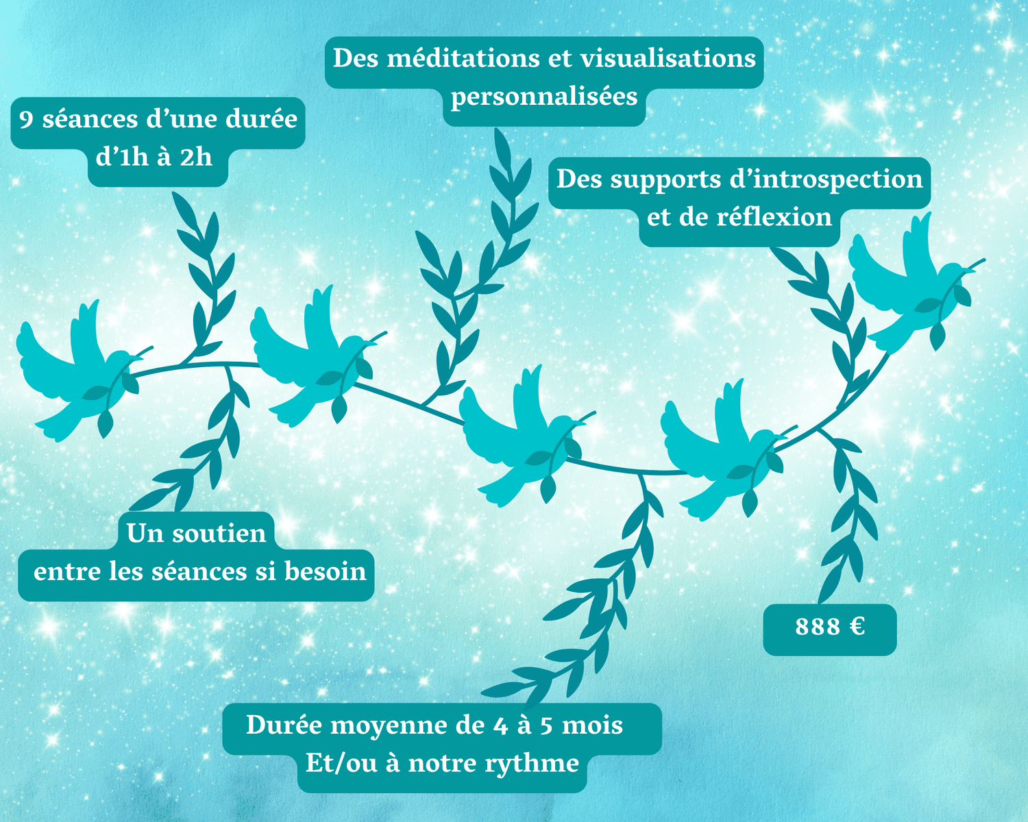 Les piliers de l’accompagnement sont : la symbiose avec les Lois et Principes Universels, l’introspection, l'expérience et la mise en pratique/action afin de ressentir et créer notre vie en conscience sur le plan énergétique puis physique.